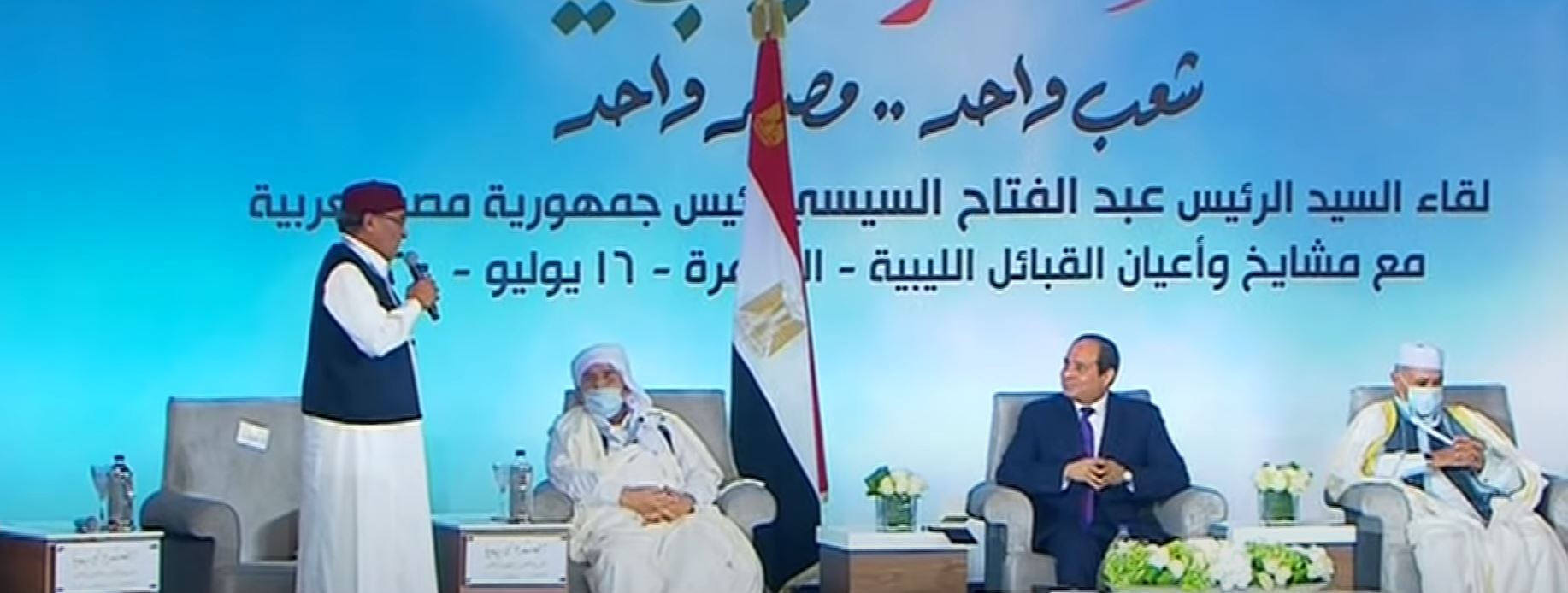 وقال في كلمة له خلال مؤتمر مشايخ وأعيان ليبيا، إن الجيش المصري من أقوى الجيوش في المنطقة وإفريقيا ولكنه رشيد، والقاهرة تدعم دائما الحل السياسي في ليبيا، مشيرا إلى عدم امتلاك أطراف النزاع لإرادة اتخاذ القرار السياسي بسبب تدخل قوى خارجية توظف بعض الأطراف لمصالحها، مشيراً إلى أن استمرار نقل المرتزقة من سوريا إلى ليبيا يهدد أمن المنطقة كلها.