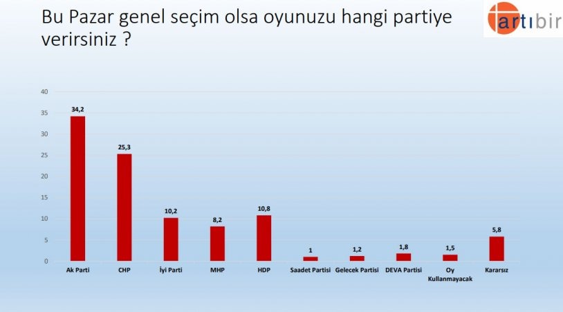 إسطنبول (زمان التركية) – كشفت نتائج دراسة حديثة أجرتها مؤسسة “Artıbir” للدراسات والأبحاث أن حزب العدالة والتنمية قد يحصل على 34.2% فقط من الأصوات في حالة عقدت انتخابات مبكرة.