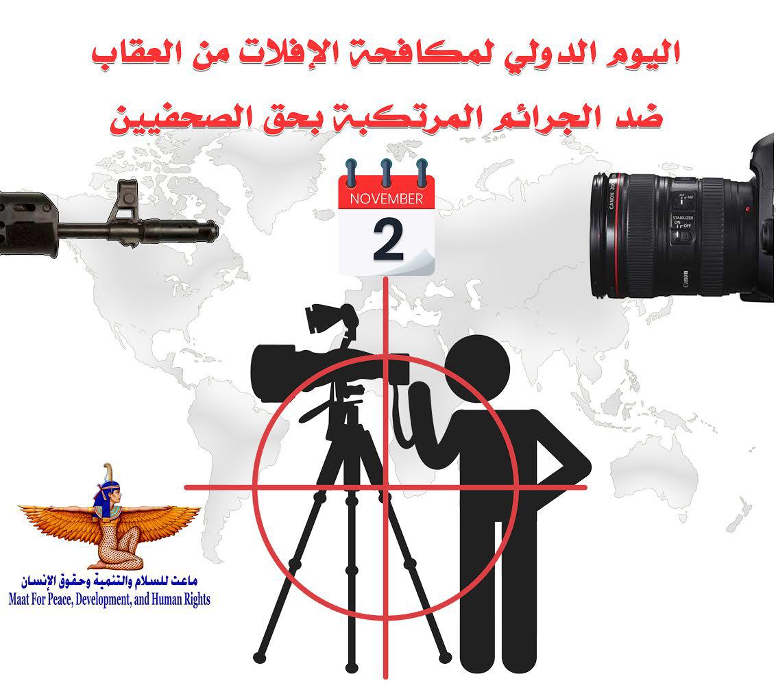 مؤسسة ماعت للسلام والتنمية وحقوق الإنسان قالت بهذه المناسبة إنها تخشى أن يؤدي الإفلات من العقاب في الجرائم المرتكبة ضد الصحفيين إالى زعزعة مجتمعات بأكملها جراء اخفاء انتهاكات خطيرة لحقوق الإنسان والفساد والجرائم، وفي هذا الصدد  تطالب الحكومات والمجتمع المدني والاعلام وكل المعنيين بدعم سيادة القانون أن ينضموا الى الجهود العالمية لإنهاء مشكلة الإفلات من العقاب، و تحث أيضا الدول الأعضاء بالأمم المتحدة على بذل قصارى جهدها لمنع العنف ضد الصحفيين والعاملين في وسائط الإعلام، وكفالة المساءلة، وتقديم مرتكبي الجرائم ضد الصحفيين والعاملين في وسائط الإعلام إلى العدالة، وضمان حصول الضحايا على سبل الانتصاف المناسبة، وتطلب كذلك إلى الدول أن تعمل على تهيئة بيئة آمنة وتمكينيه للصحفيين لأداء عملهم بصورة مستقلة ودون تدخل لا داعي له .