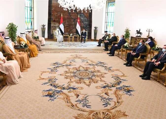 في السياق، أشاد الرئيس بالتطور الكبير والنوعي الذي شهدته العلاقات المصرية الإماراتية في المجالات السياسية والاقتصادية والأمنية والعسكرية وغيرها، والنمو الملحوظ في معدل التبادل التجاري وحجم الاستثمارات، مشيراً إلى الحرص المشترك للمضي قدماً نحو مزيد من تعميق وتطوير تلك العلاقات.