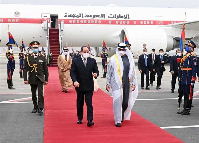 وقال السفير بسام راضي، الناطق الرسمي باسم رئاسة الجمهورية، إن الرئيس رحب بالشيخ محمد بن زايد آل نهيان، ضيفاً عزيزاً في بلده الثاني مصر، معبراً عن الامتنان بلقائه مجدداً لاستمرار التشاور والتنسيق تجاه مختلف القضايا محل الاهتمام المشترك، وكذلك موضوعات التعاون الثنائي وذلك في إطار العلاقات التاريخية والاستراتيجية بين مصر والإمارات، تلك العلاقات التي أرسى دعائمها المغفور له الشيخ زايد بن سلطان آل نهيان لتستمر عبر عقود ولتزداد قوة بإرادة مشتركة صادقة في إطار من الأخوة والاحترام المتبادل والثقة والتفاهم والمصير المشترك، حيث أثبتت السنوات الأخيرة فاعلية تلك العلاقات في مواجهة المخاطر التي استهدفت أمن المنطقة ومصالح شعوبها ومقدرات دولها. وفق بيان صادر عن رئاسة الجمهورية.
