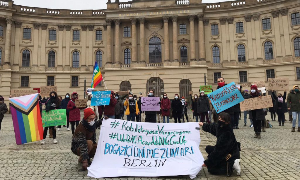 الوقفة الاحتجاجية التي شارك فيها خريجين من جامعة البوسفور ومن جامعات تركية أخرى وعدد من المتضامنين الألمان معهم، تم الإعلان خلالها عن التضامن مع طلاب البوسفور الذين انتفضوا بسبب تعيين قيادي بحزب العدالة والتنمية في رئاسة الجامعة.
