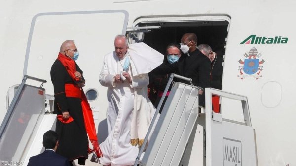 وفي وقت سابق من اليوم، هبطت طائرة البابا فرنسيس في مطار بغداد الدولي، وكان في استقباله رئيس الحكومة العراقية مصطفى الكاظمي.