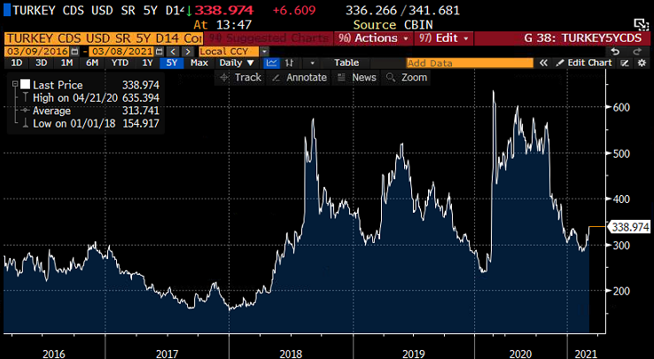 هذا وارتفع سعر مبادلة مخاطر الائتمان بالتزامن مع ارتفاع سعر الدولار أمام الليرة ليسجل أعلى مستوياته خلال عام 2021 الحالي ببلوغه 338 نقطة.