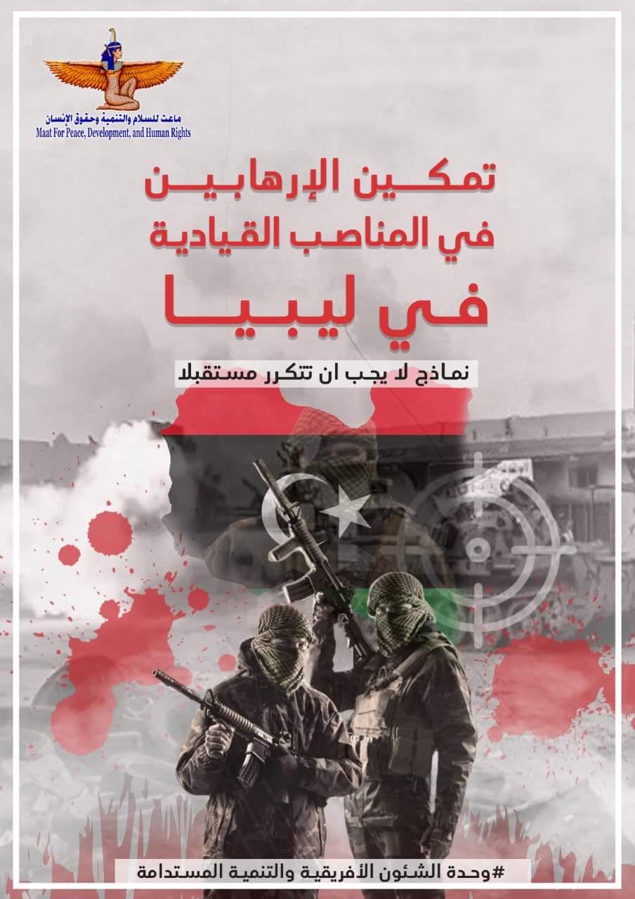مؤسسة ماعت للسلام والتنمية وحقوق الإنسان أصدرت تقريراً تحت عنوان “تمكين الإرهابيين في المناصب القيادية في ليبيا .. نماذج يجب ألا تتكرر مستقبلا”.