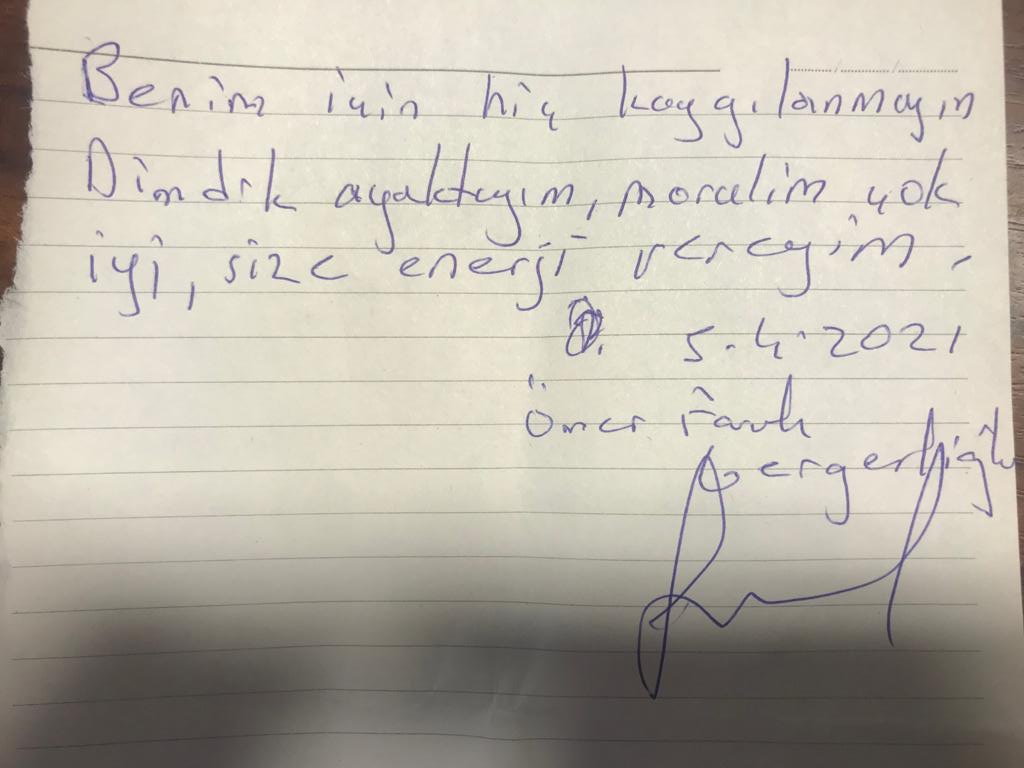 وقال جرجرلي أوغلو في رساله بخط يده: “لا تقلقوا علي، أنا أقف صامدا، لا أشعر بالاكتئاب. لدي الكثير من العمل للقيام به”.