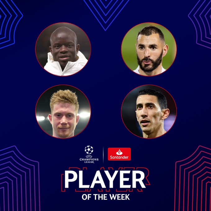 وضمت قائمة المرشحين للفوز بجائزة أفضل لاعب في ذهاب نصف نهائي دوري الأبطال، 4 لاعبين، وهم لاعب خط وسط نادي تشيلسي، الفرنسي نغولو كانتي، ومواطنه، مهاجم ريال مدريد، كريم بنزيما، وصانع ألعاب نادي مانشستر سيتي، البلجيكي كيفين دي بروين، وجناح باريس سان جيرمان، الأرجنتيني أنخيل دي ماريا.