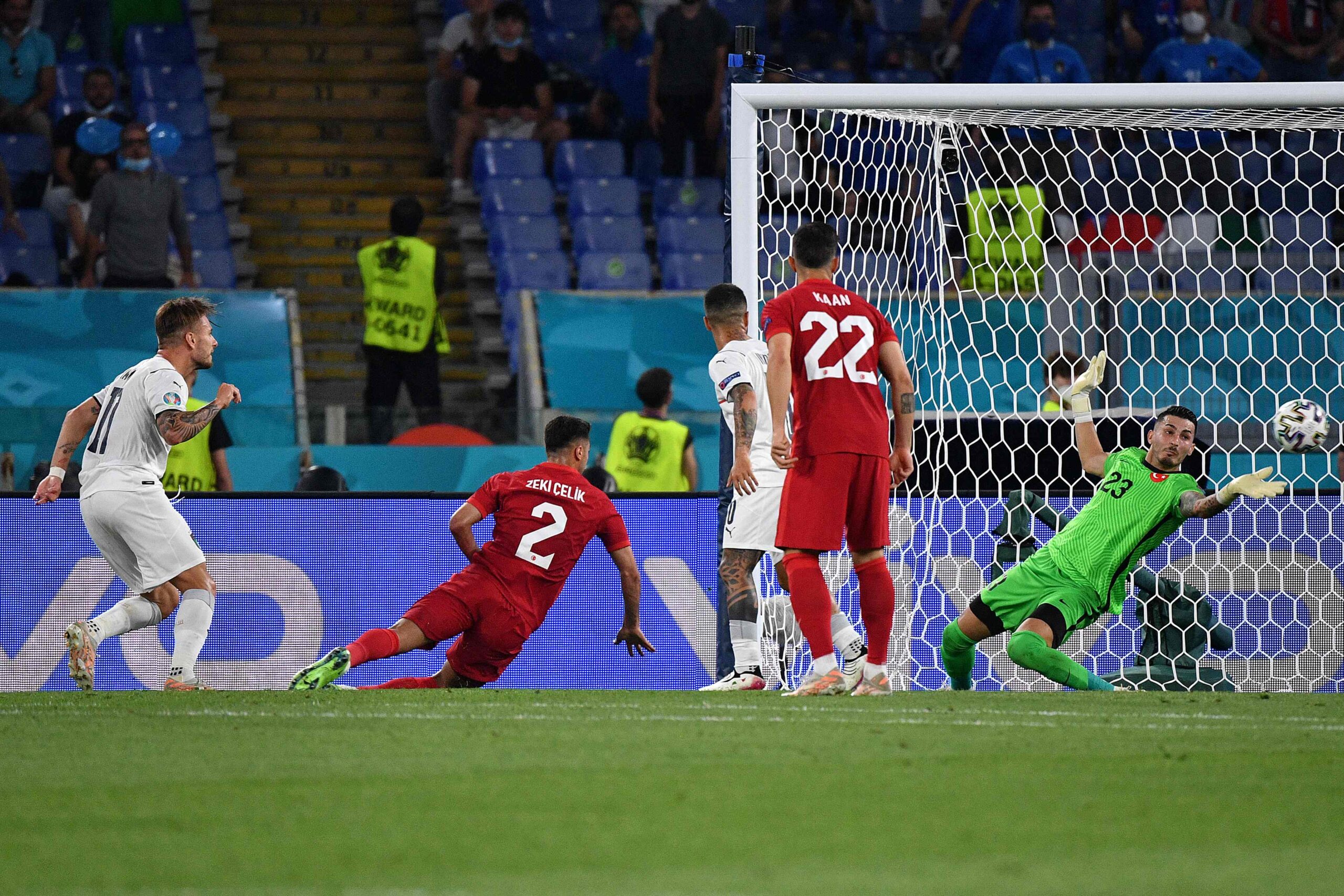 Italy's forward Ciro Immobile (L) scores his team's second goal during the UEFA EURO 2020 Group A football match between Turkey and Italy at the Olympic Stadium in Rome on June 11, 2021. / AFP / POOL / Filippo MONTEFORTE