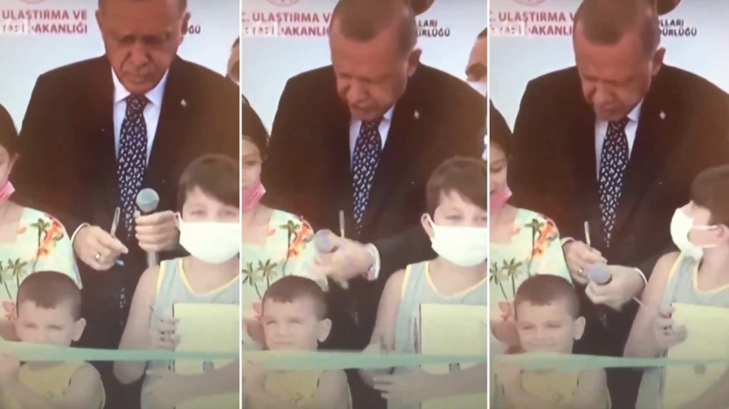 أردوغان كان يشارك شارك في حفل افتتاح مشروع نفق سلارها بولاية ريزا، ولكن خلال حديثه، قص الطفل الصغير الشريط قبل أردوغان، مما تسبب في غضب الرئيس التركي منه.
