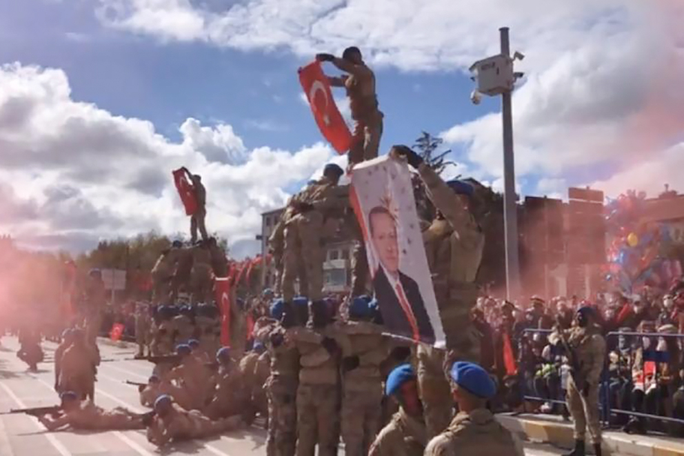 خلال إحدى احتفالات عيد الجمهورية التي أقيمت الجمعة في ولاية كاستامونو، رفعت قوات الكوماندوز ملصق رئيس حزب العدالة والتنمية الرئيس التركي، رجب طيب أردوغان.