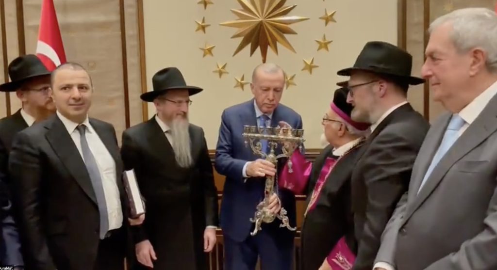 وشوهد الحاخام الأكبر إيزاك هاليفا وهو يعطي معلومات لأردوغان حول الشمعدان ذي الفروع السبعة.