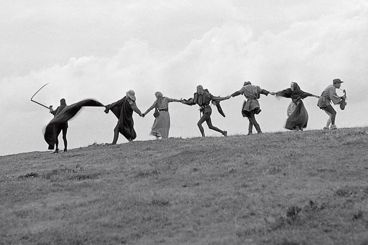 فالموت، وإن كان البشر قد اقتنعوا به كنهاية لحياتهم، إلا أن الفن يبقى برسالته الممثلة في الغناء تارة وأداء الأدوار الهزلية تارة أخري.. فغناء زوجة المهرج لكلمات من أشعاره وموسيقى آلته جعلت الفارس “أنطونيوس” ينصت لها بحب، ليشعر بلحظات من الهدوء النفسي جعله ينسى، ولو مؤقتا، فكرة أن ساعة موته قد قربت، وينعم بمشهد الزوجة والزوج وطفلهما الذين ينعمون بالطمأنينة والسكينة برغم فقرهم.