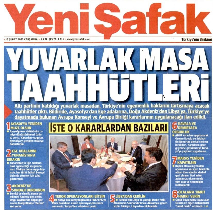 وزعمت الصحيفة أنه في اجتماع المائدة المستديرة الذي عقده 6 من قادة أحزاب المعارضة، تم تقديم “التزامات من شأنها أن تفتح حقوق تركيا السيادية في النقاش”.
