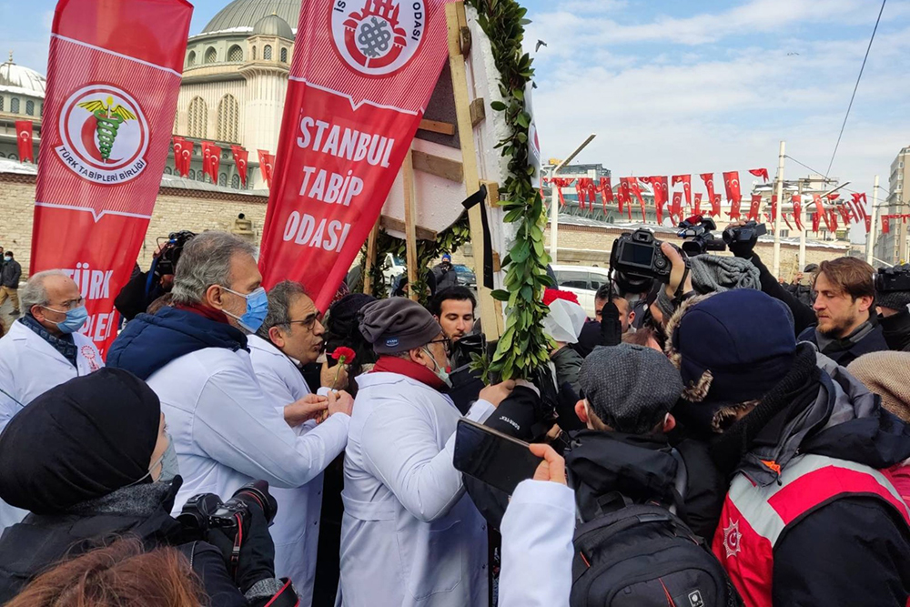 وخلال المظاهرة منعت الشرطة الأطباء من وضع أكاليل الزهور في ميدان تقسيم بمناسبة يوم الطب.