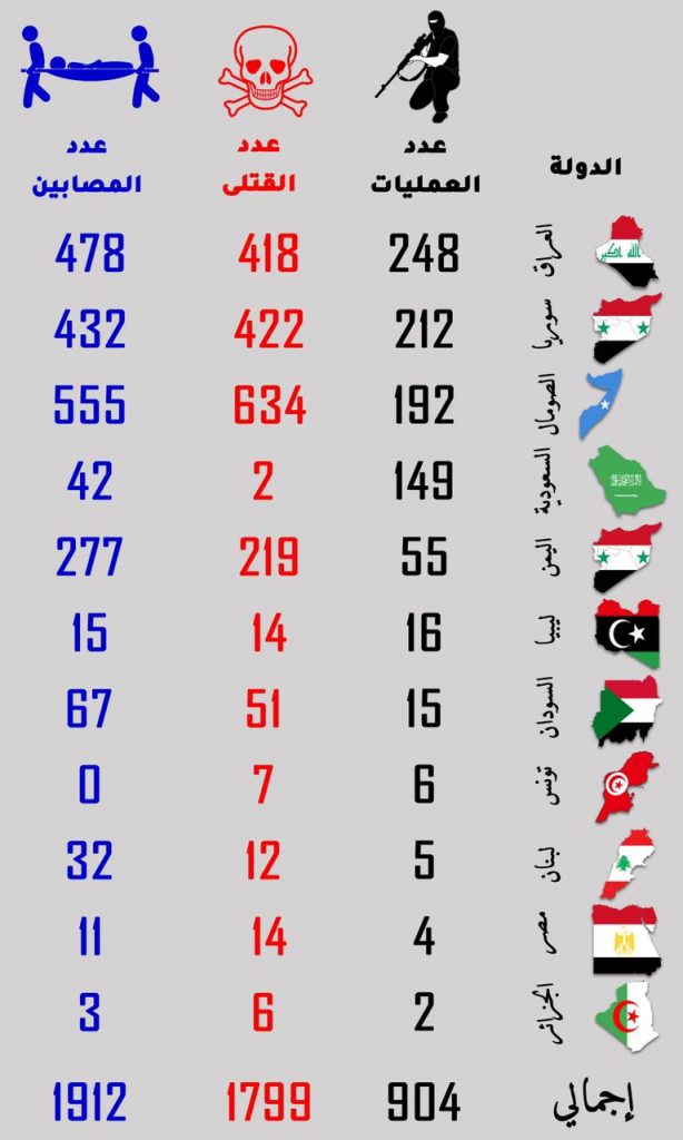 وأوضح التقرير إن تنظيم داعش في العراق وسوريا والفروع المُنتسبه له، وحركة الشباب في الصومال، والحوثيين في اليمن، وهيئة تحرير الشام في سوريا، جاءت كأكثر الجماعات الإرهابية نشاطًا في 2021 في المنطقة العربية، حيث تبنت هذه الجماعات ونُسب لها 651 عملية إرهابية وهو ما نسبته 72% من إجمالي العمليات الإرهابية وهم المسؤولين أيضا عن أكبر نسبة من الوفيات في الدول العربية جراء الإرهاب في عام 2021.