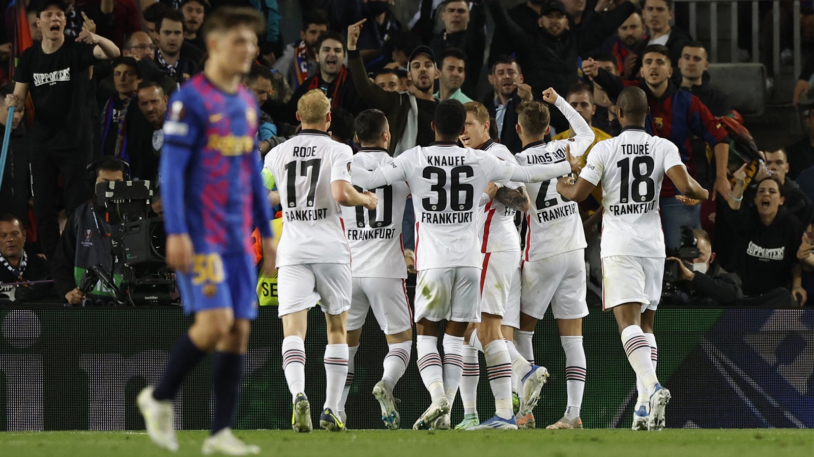 برشلونة (زمان التركية) – فجر نادي أينتراخت فرانكفورت الألماني مفاجأة كبيرة، بإقصائه مضيفه برشلونة الإسباني من ربع نهائي الدوري الأوروبي لكرة القدم، بعد فوزه عليه 3-2 إيابا، أمس الخميس.