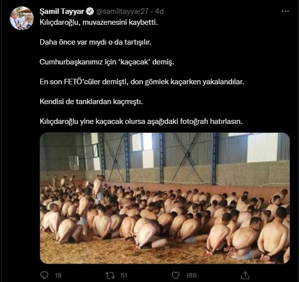 من جانبه، وجه نائب حزب العدالة والتنمية السابق شامل طيار تهديدات لزعيم المعارضة عبر تغريدة أرفقها بصورة للانقلابيين المزعومين الذين تعضروا للتعذيب ليلة الانقلاب الفاشل، معقبا بقوله: “كليجدار أوغلو فقد توازنه. فهل كان متوازنًا من قبلُ أمر مشكوك فيه! إنه زعم ان الرئيس سيهرب! هذا زعم سبق أن ساقه الانقلابيون لية 15 يوليو 2016، لكننا أمسكناهم عراة بينما كانوا يحاولون الهورب ليلة الانقلاب.. وهو (كليجدار أوغلو) أيضًا كان هرب من الدبابات في هذه الليلة.. فإذاما سيقدم كليجدار أوغلو على الهروب مرة أخرى أذكره بهذه الصورة!”، على حد قوله.