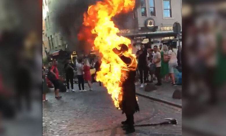 وفي بادئ الأمر اعتقد المارة أن الأمر برمته بمثابة استعراض فني، غير أن العاملين في أحد فنادق المنطقة سارعوا إلى إخماد النيران باستخدام طفاية حريق.
