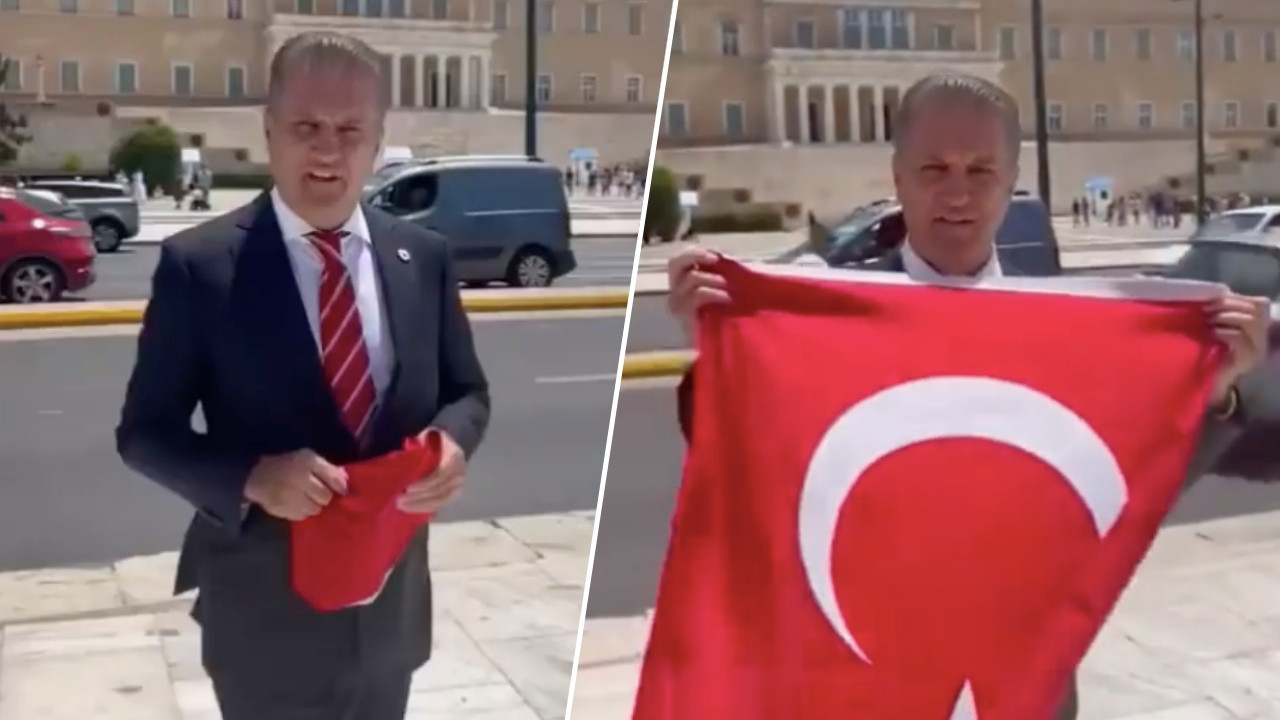 ساريجول ظهر في الصور رافعا العلم التركي من أمام مبنى البرلمان اليوناني.