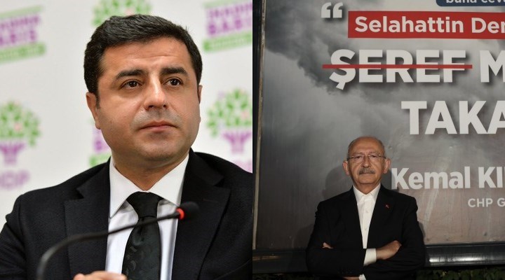 وحملت اللافتات عبارة منسوبة إلى كيليجدار أوغلو تقول “سأضع وسام شرف على صدر صلاح الدين دميرتاش”.