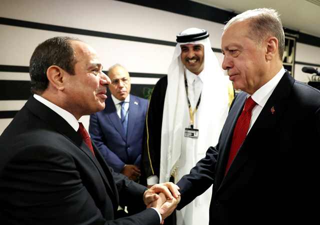 حظيت صورة الرئيس رجب طيب أردوغان وهو يصافح الرئيس المصري السيسي على هامش افتتاح كأس العالم في قطر، باهتمام واسع.