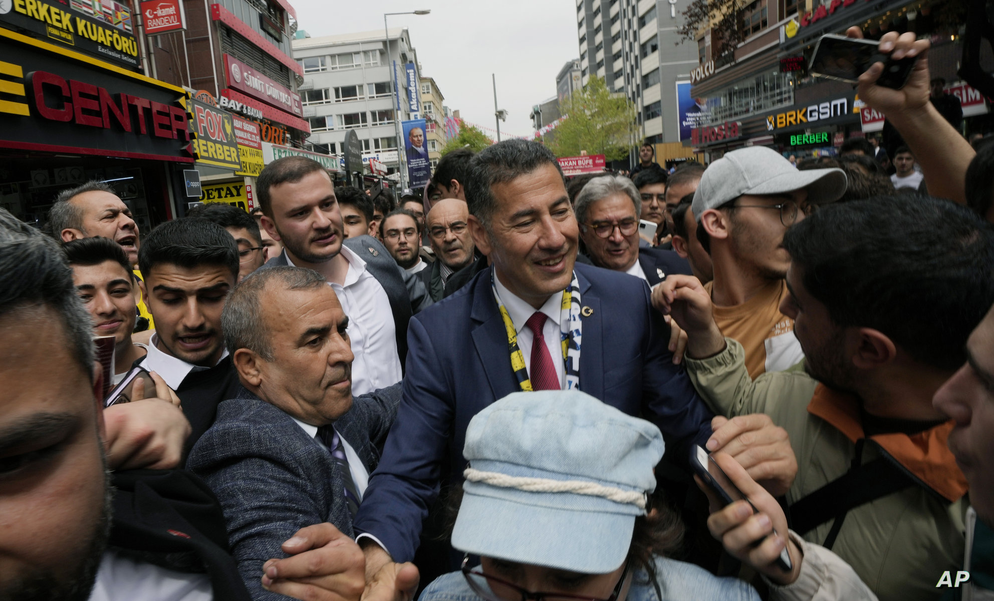 Sinan Ogan, center, an academician and presidential candidate from ATA (Ataturk) alliance, formed of nationalist political parties, is surrounded by supporters during a city tour, in Ankara, Turkey, Thursday, May 4, 2023. Ogan, 53, is the youngest candidate to challenge President Recep Tayyip Erdogan in May 14 elections. (AP Photo/Burhan Ozbilici)