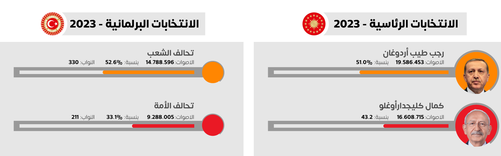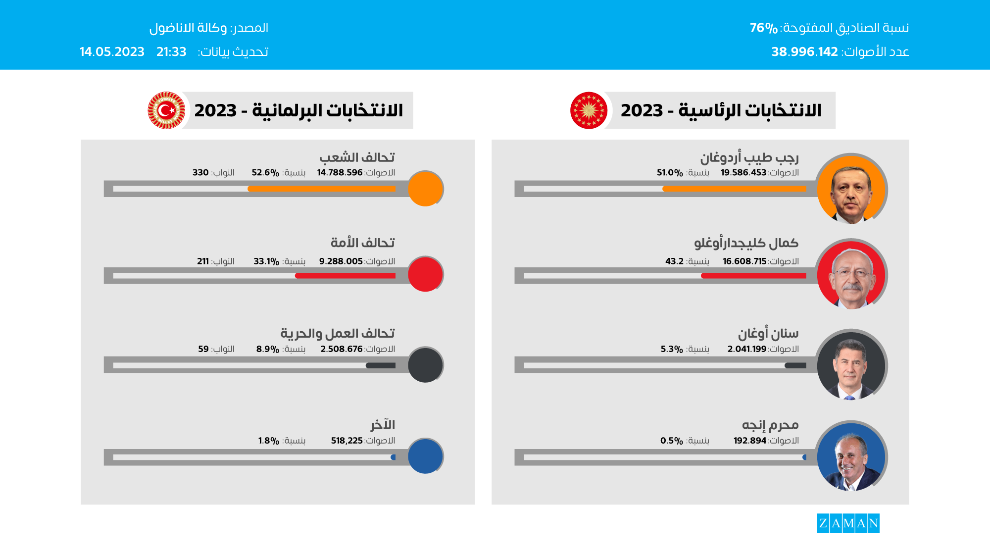 ووفق وكالة الأناضول الرسمية، فإنه بعد فرز 73 بالمئة من الأصوات في الانتخابات الرئاسية فإن نسبة أردوغان تبلغ 51 بالمئة، ونسبة أصوات كليجدار أوغلو 43 بالمئة،وفيما يخص الانتخابات البرلمانية تبلغ نسبة أصوات تحالف الشعب الحاكم 52 بالمئة، وأصوات تحالف الأمة المعارض 33 بالمئة.