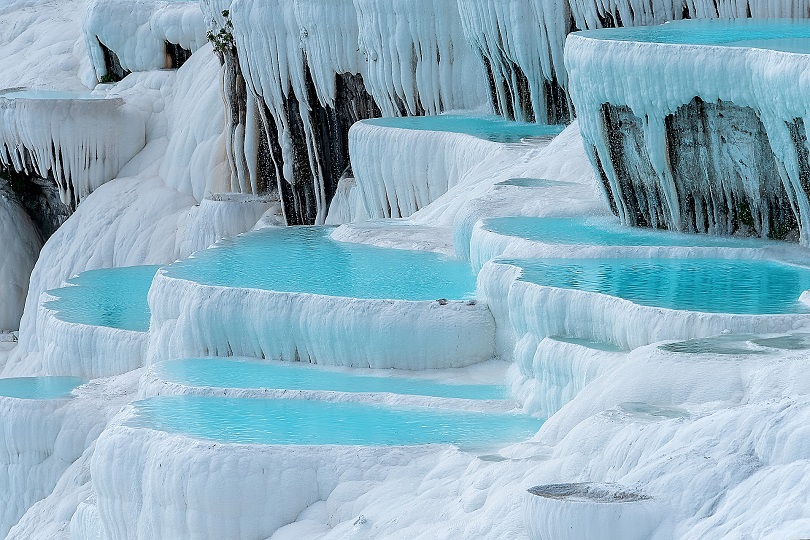 تتميز”باموق قلعة” بصخورها الكلسية البيضاء المشابهة للقطن، ومن هنا يأتي اسم المنطقة “القلعة القطنية.”