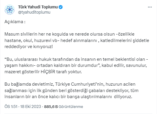 وأدلت الطائفة اليهودية التركية في بيانها على منصة التواصل الاجتماعي X الجريمة، وقالت “نحن نرفض وندين بشدة استهداف وقتل المدنيين الأبرياء تحت أي ظرف من الظروف وفي أي مكان – وخاصة المستشفيات والمدارس ودور رعاية المسنين، وما إلى ذلك!”.