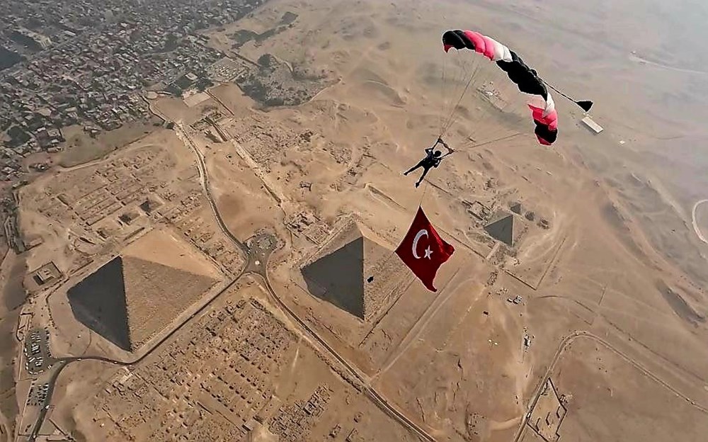 أنقرة (زمان التركية) – قام تركي بالقفز الحر بالمظلة فوق الأهرامات في مصر ورفع العلم التركي بمناسبة الاحتفال بمرور 100 عام على الجمهورية.