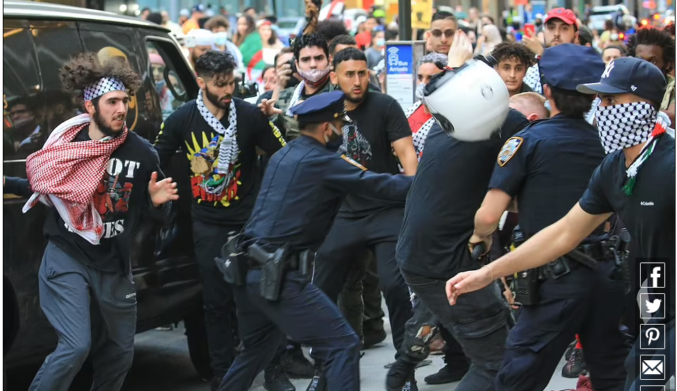 واحتشد المتظاهرون المؤيدون لإسرائيل وآخرون مؤيدون لفلسطين أمام مكتب إدارة جامعة مدينة نيويورك، وقد وقف الفريق الأول لـ”حراسة منشورات تحمل صور الأشخاص الذين أسرتهم حركة حماس”.