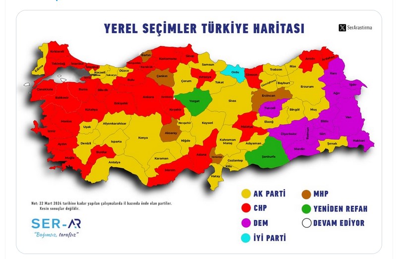 وبحسب نتائج استطلاع الرأي الذي أجري في الثاني والعشرين من مارس/ آذار الجاري، سيحتفظ حزب الرفاه من جديد ببلديتي أورفة ويوزجات، وسيحافظ حزب الشعب الجمهوري على بلديات إسطنبول وإزمير وأنقرة، التي انتزعها من حزب العدالة والتنمية الحاكم في 2019.