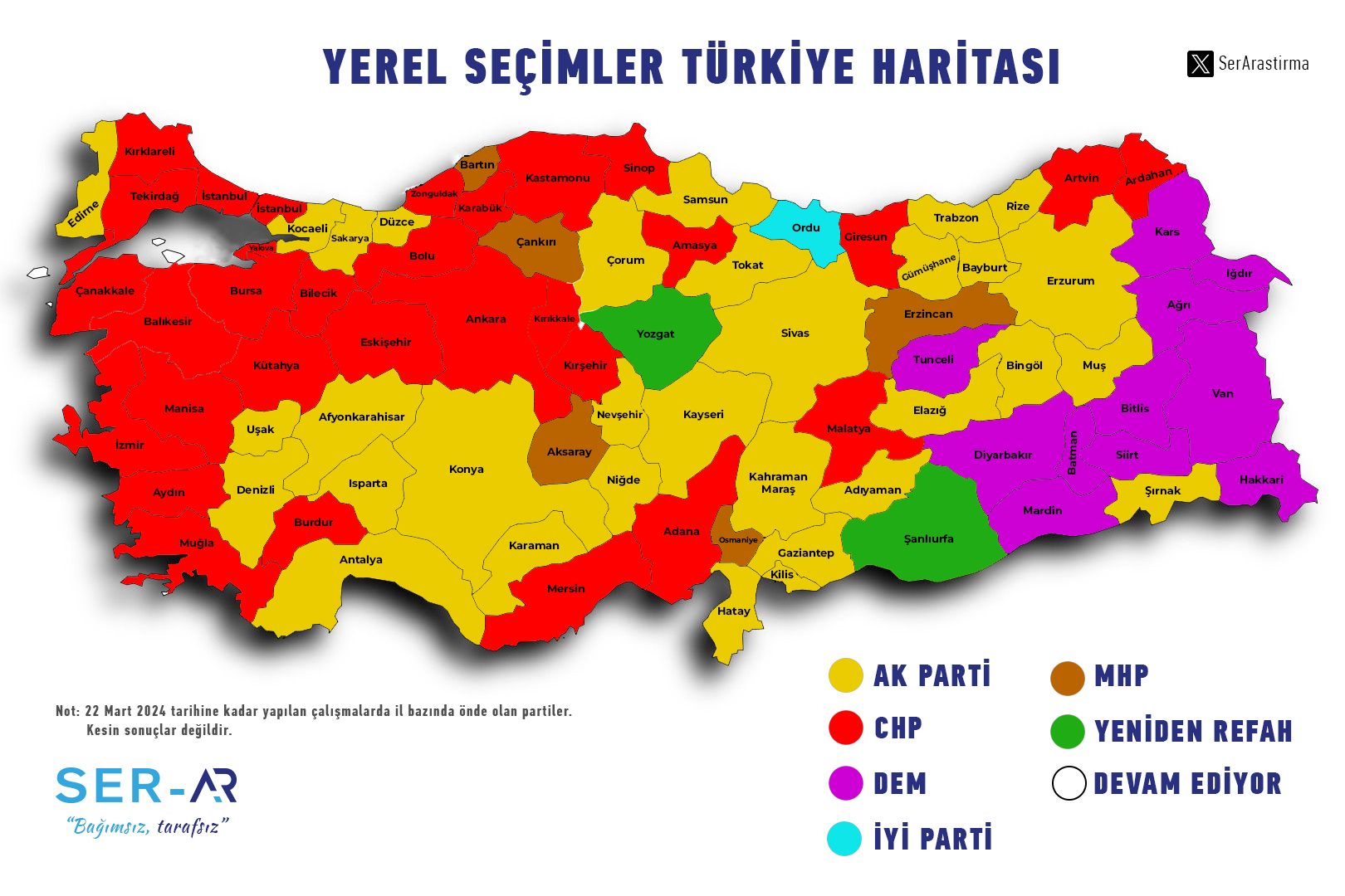 وأشارت نتائج استطلاع الرأي إلى فوز حزب العدالة والتنمية يفوز بـ 32 بلدية وحزب الشعب الجمهوري بـ 30 بلدية وحزب الديمقراطية والمساواة للشعوب ب11 بلدية وحزب الحركة القومية ب5 بلديات وحزب الرفاة من جديد ببلديتين وحزب الجيد ببلدية واحدة.