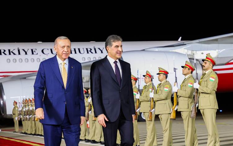 وكان في استقبال أردوغان، بمراسم رسمية، رئيس إقليم كوردستان نيجيرفان بارزاني، في مطار أربيل.