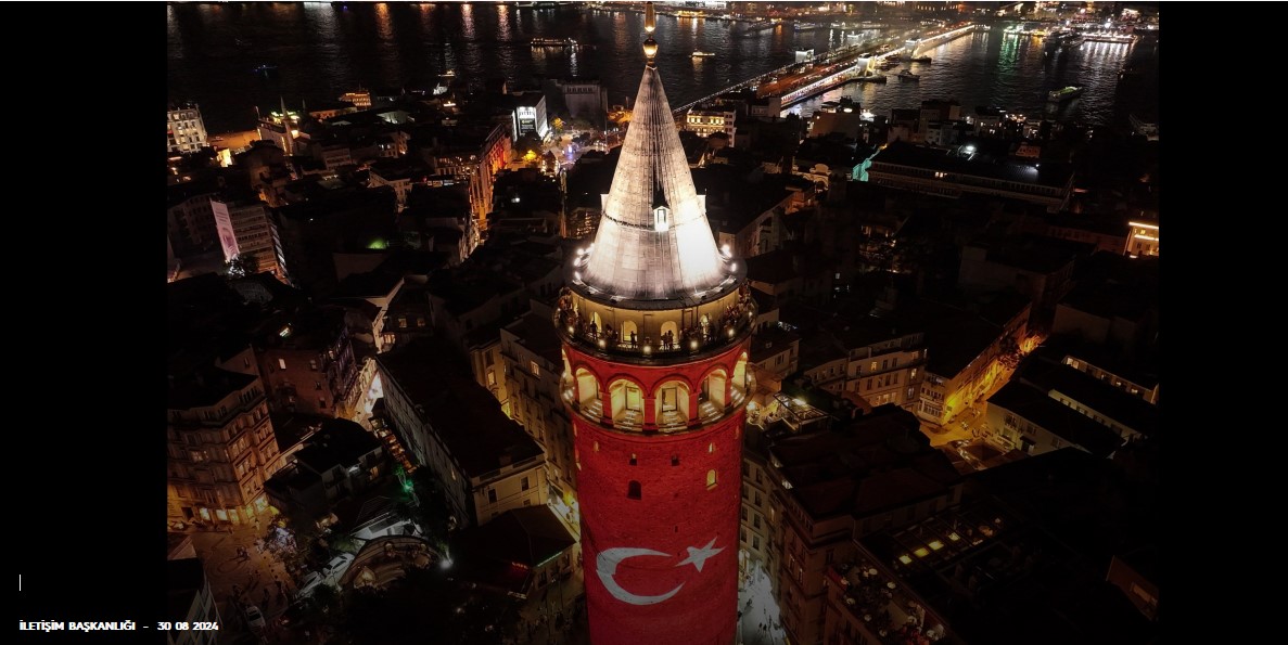 تم عرض العلم التركي وشعار عيد النصر في 30 أغسطس على برج غلطة ومتحف بشيكطاش البحري وبوابة القسم في إسطنبول من قبل مديرية الاتصالات الرئاسية.