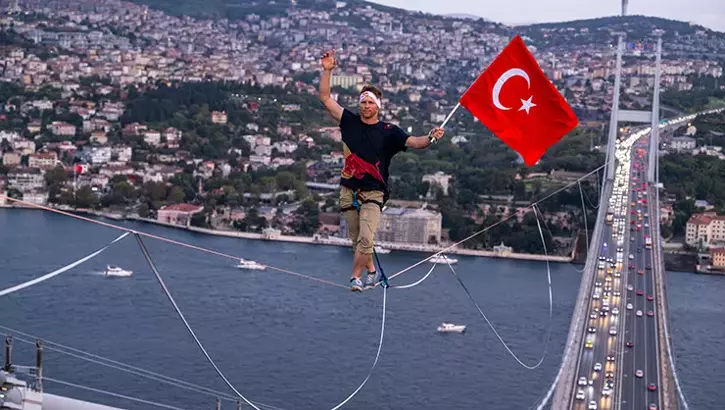 يوم الأحد الماضي/سار روز، من الجانب الأناضولي إلى الجانب الأوروبي على حبلٍ مثبت على جسر شهداء 15 يوليو “البسفور” في إسطنبول، ليدخل التاريخ باعتباره ”أول شخص يعبر بين القارات على حبل”.