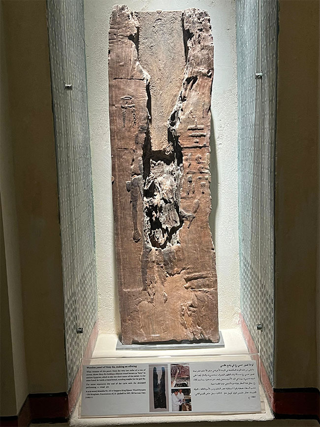 ويعيد المعرض تجسيد المشهد الأصلي للألواح الخشبية داخل المصطبة، بما في ذلك نسخة طبق الأصل بالحجم الكامل للممر الغربي من مقبرة حسائي رع في سقارة. وتُعرض الألواح الخشبية الأصلية في محاريب تحاكي سياقها التاريخي، مع جدار شرقي مزين بنقوش تشبه تلك التي وجدت في المقبرة القديمة.