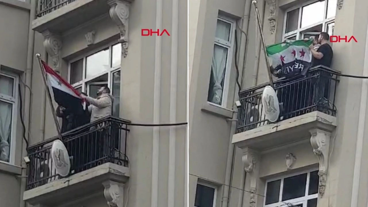 أنقرة (زمان التركية) – احتفل معارضون سوريون بالإطاحة بالرئيس بشار الأسد من خلال إنزال العلم عن قنصلية بلادهم في مدينة إسطنبول التركية.