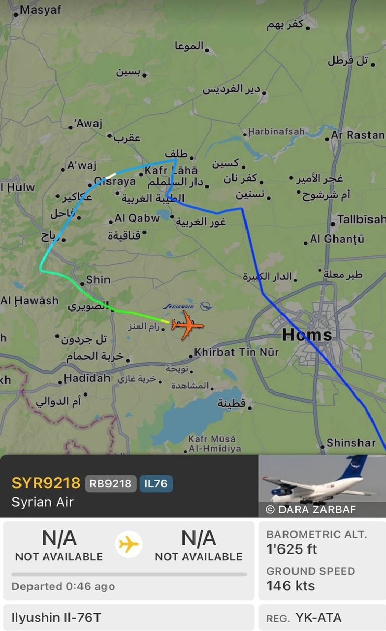 ويظهر موقع FlightRadar24 لرصد حركة الطيران انطلاق طائرة من مطار بدمشق، من ثم اختفاء أثرها من أجهزة الرادار فور وصولها إلى غرب مدينة حمص وسط ادعاءات حول كون الأسد على متن تلك الطائرة.