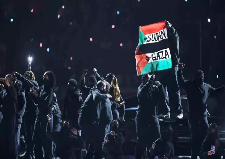 وتظهر اللقطات المتداولة على مواقع التواصل الاجتماعي الرجل وهو يعتلي المسرح خلال استعراض مغني الراب كندريك لامار وهو يرفع العملين الفلسطيني والسوداني احتجاجا منه على الإبادة التي ترتكبها إسرائيل بقطاع غزة والحرب المتواصلة بالسودان.
