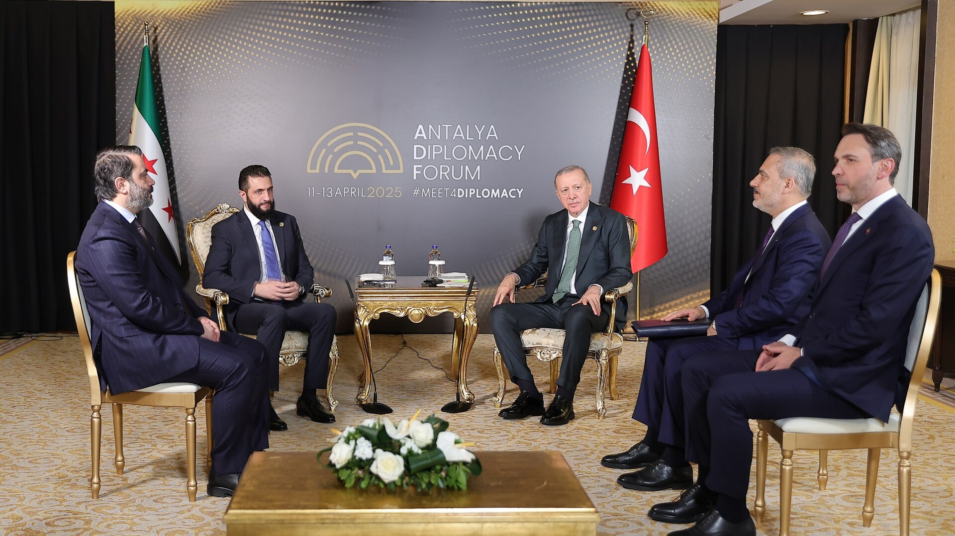ونقلت وكالة “سانا” بيانا للرئاسة السورية جاء فيه: “رئيس الجمهورية العربية السورية السيد أحمد الشرع ومعالي وزير الخارجية السيد أسعد الشيباني يلتقيان رئيس الجمهورية التركية السيد رجب طيب أردوغان ووزير الخارجية التركية السيد هاكان فيدان، على هامش منتدى أنطاليا الدبلوماسي في نسخته الرابعة”.