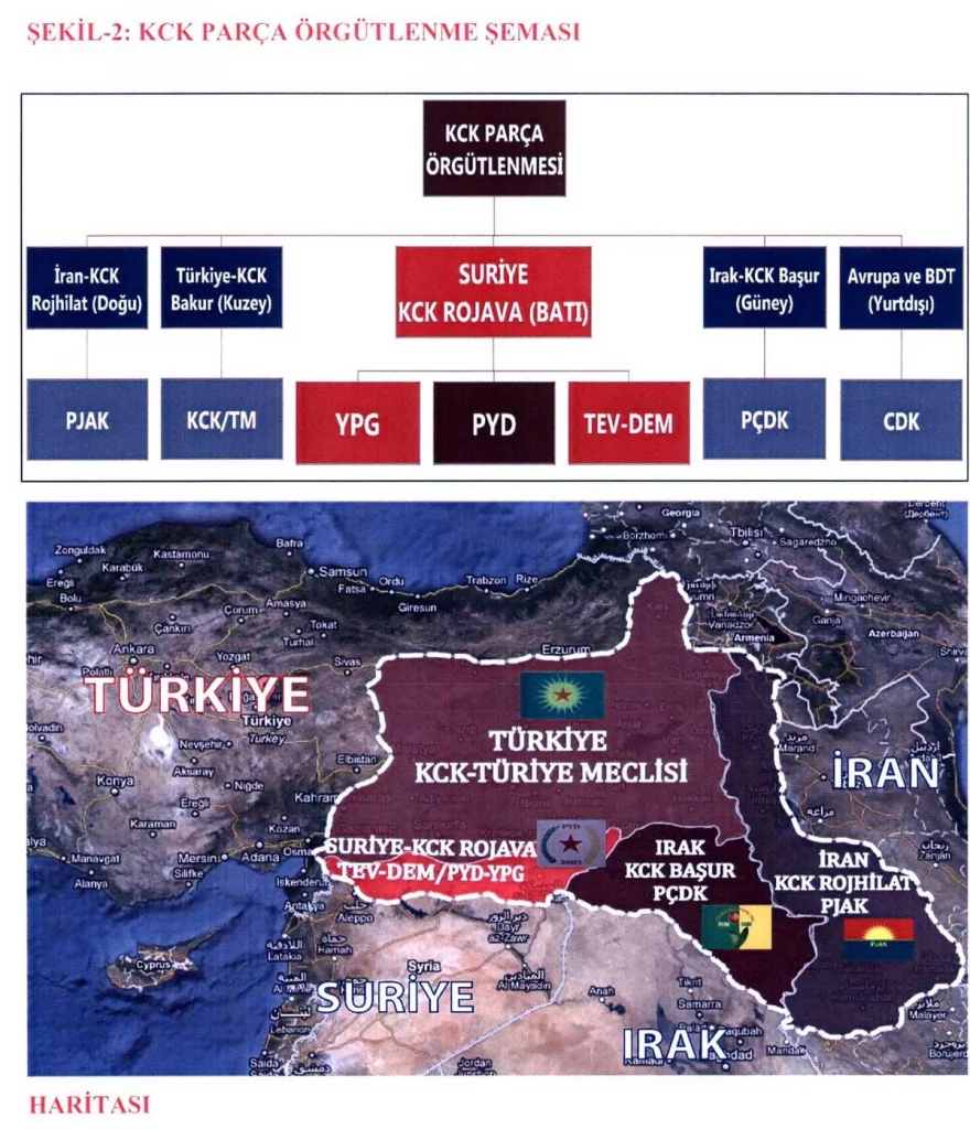 يُذكر أن حزب الاتحاد الديمقراطي يعمل مباشرة وفقًا لتعليمات وتوجهات قيادة اتحاد مجتمعات كردستان. ويُشدد على أن مجالس الشعب المزعومة قد تأسست لضمان إقامة الإدارة الذاتية، وأن هذا النظام يُراد تطبيقه بنفس الأسلوب وطريقة التنظيم بالضبط في شرق وجنوب شرق تركيا. كما أفيد بأنه نظرًا للحاجة إلى تنظيم مسلح في المناطق المتمتعة بالحكم الذاتي، تم تشكيل تنظيمات بأسماء YPG وSDG. ويُسجل أن حزب الاتحاد الديمقراطي يمثل البعد السياسي والدبلوماسي، وهيكل TEV-DEM يمثل القاعدة الاجتماعية ومجلس الشعب، وأن وحدات حماية الشعب (YPG) تشكل ذراع النضال المسلح والدفاع، وأن حزب الاتحاد الديمقراطي وTEV-DEM يتلقيان الأوامر من KCK، وأن YPG تتلقى الأوامر من الجناح المسلح لحزب العمال الكردستاني، HPG.