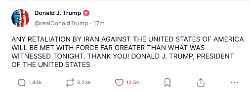 نشر الرئيس الأمريكي ترامب منشورًا جديدًا على منصة Truth Social. قال ترامب في منشوره: “أي انتقام من قبل إيران ضد الولايات المتحدة سيُقابل بقوة أكبر بكثير مما شهدناه الليلة. شكرًا لكم! دونالد ج. ترامب، رئيس الولايات المتحدة الأمريكية”.