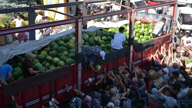 مزارع البطيخ محمد قوتسال وزع شاحنة بحمولة 26 طن من البطيخ، أحضرها من أضنة، مجانًا على المواطنين، خلال 45 دقيقة فقط.