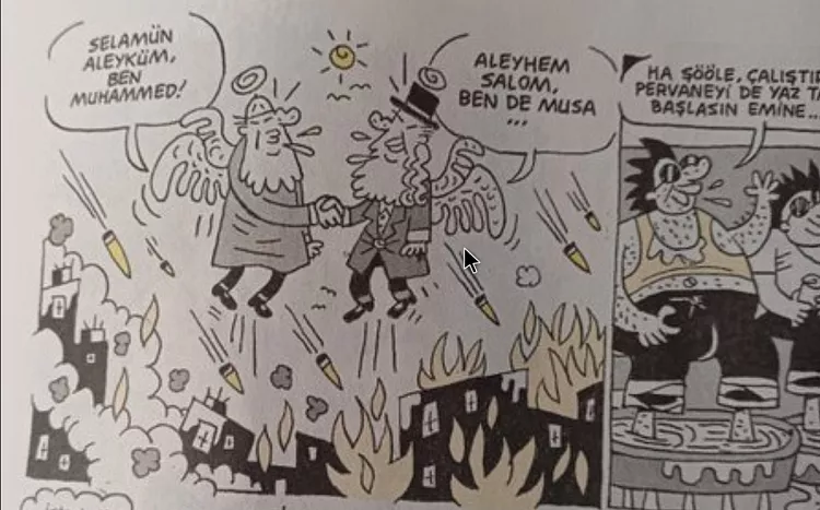 ليمان وهي الفرع التركي للمجلة الفرنسية “شارلي إيبدو”، نشرت شخصيتين باسم “محمد” و”موسى” فوق مدينة تتعرض للقصف، وهما يتبادلان التحية ويتصافحان، وفي الكاريكاتير يقول الشخص الأول “السلام عليكم أنا محمد”، فيرد الشخص الثاني “عليكم السلام أنا موسى”.