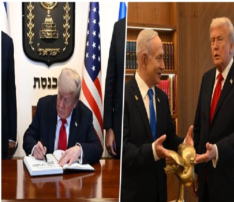 وفي سجل الكنيست الإسرائيلي، دون ترامب عبارة “هذا شرف كبير لي. يوم مهم ورائع وبداية جديدة”.