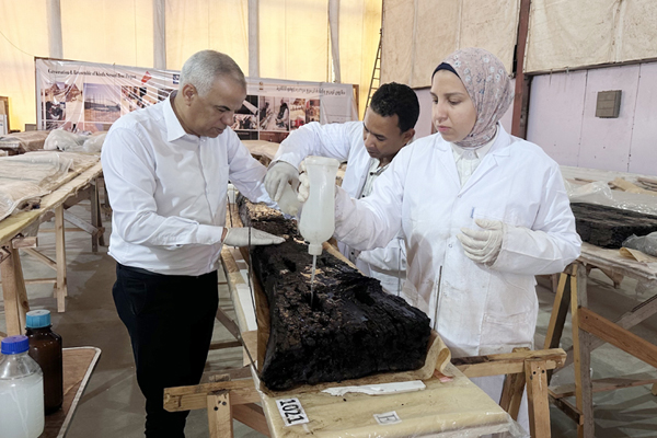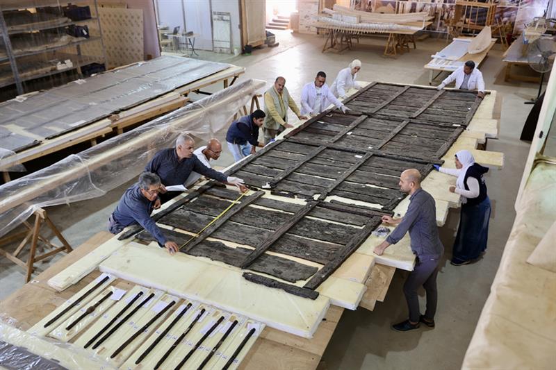 وقال زيدان إن فريقا مصريا يابانيا مشتركا بدأ العمل بعد ذلك بوقت قصير، حيث قام بإزالة 1698 قطعة خشبية بعناية من 13 طبقة مكدسة داخل الحفرة، مضيفا أنه تم تطبيق معالجات الحفظ الأولية في الموقع قبل نقل القطع إلى معامل الترميم بالمتحف المصري الكبير حيث اكتملت عملية الحفظ الطويلة والدقيقة، وستستمر عملية إعادة البناء.