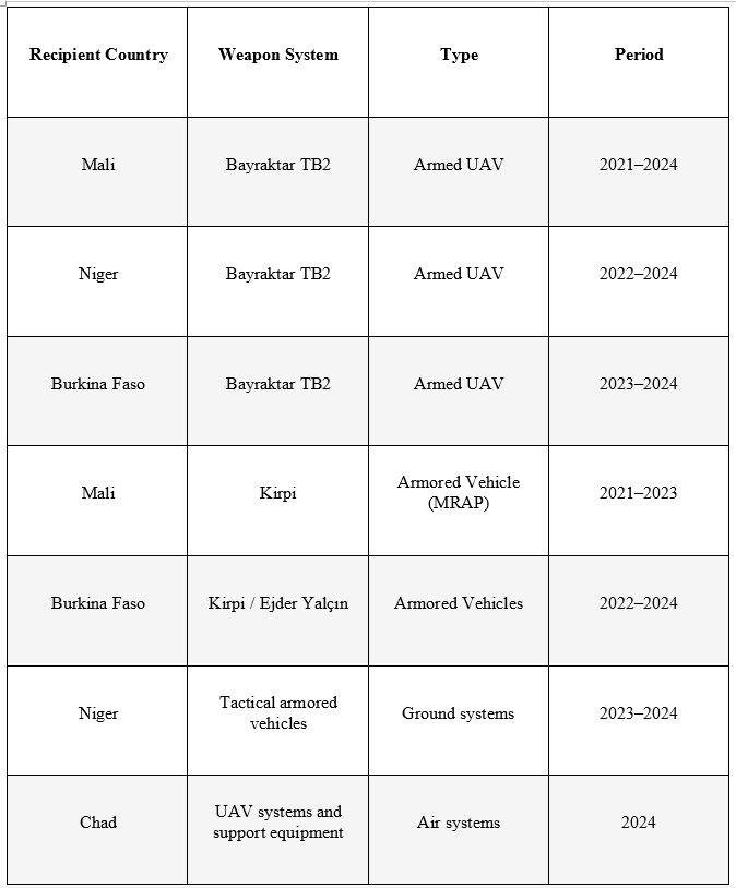 صادرات مختارة من الأسلحة التركية إلى دول الساحل (2018-2024):إلى جانب التعاون الرسمي بين الدول، اعتمدت تركيا أيضاً على جهات عسكرية خاصة لتوسيع نفوذها مع الحد من انكشافها السياسي. وتشير التقارير إلى أن شركات مثل “سادات” تعمل في مالي والنيجر، حيث تقدم التدريب لوحدات مختارة، بما في ذلك تشكيلات أمنية مرتبطة بالسلطات الانتقالية. كما تشير التقارير إلى وجود مقاتلين سوريين في النيجر منذ عام 2023، مكلفين بحماية منشآت النفط ومواقع التعدين والقواعد العسكرية، مع مشاركة محدودة في العمليات. يتيح هذا النموذج لأنقرة توسيع نفوذها بتكلفة منخفضة نسبياً مع الحفاظ على قدر من الإنكار المعقول.