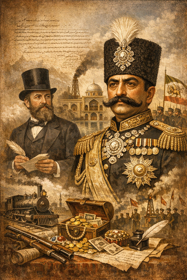 لقد اصطاد البارون رويتر ملك إيران بخطاب تملق لا قيمة له، ومبلغ من المال ربما كان ذا قيمة في ذلك الوقت، وهو ثمن بخس لملك يحكم بلدًا عظيمًا، وثمن بخس لمواطن غالٍ لا يُباع. ولكن صائد الملوك عرف مدخل الملك الأحمق، فجاءه من حيث لا يمكن أن يرفض، مستغلًا إعجاب الملك الزائد بنفسه وافتقاره إلى الحكمة اللازمة لقيادة البلاد. فجعل شاه ناصر الدين قاجار من نفسه رصيدًا رخيصًا لأجانب لا يعنيهم سوى الاستيلاء على الموارد واستغلالها والأرباح من ورائها.